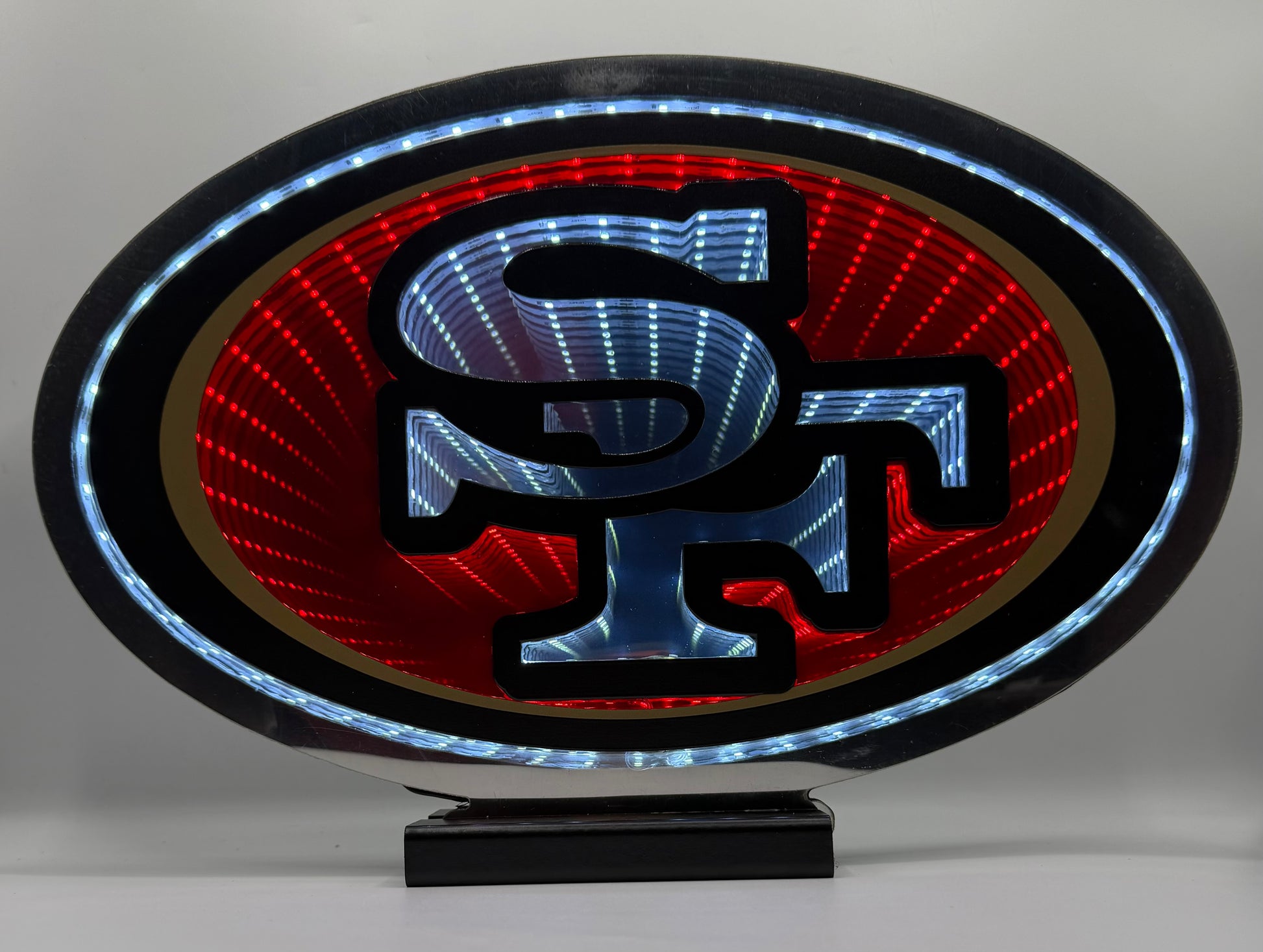 Upgrade your fan space with this San Francisco 49ers Infinity LED Light, designed to create a bold illusion of endless depth. Built with layered mirrors and bright LEDs, the iconic intertwined "SF" oval logo appears to stretch infinitely inward, delivering a striking 3D glow that instantly stands out when illuminated. The sleek lighting effect gives it a modern, high-impact look that turns heads.