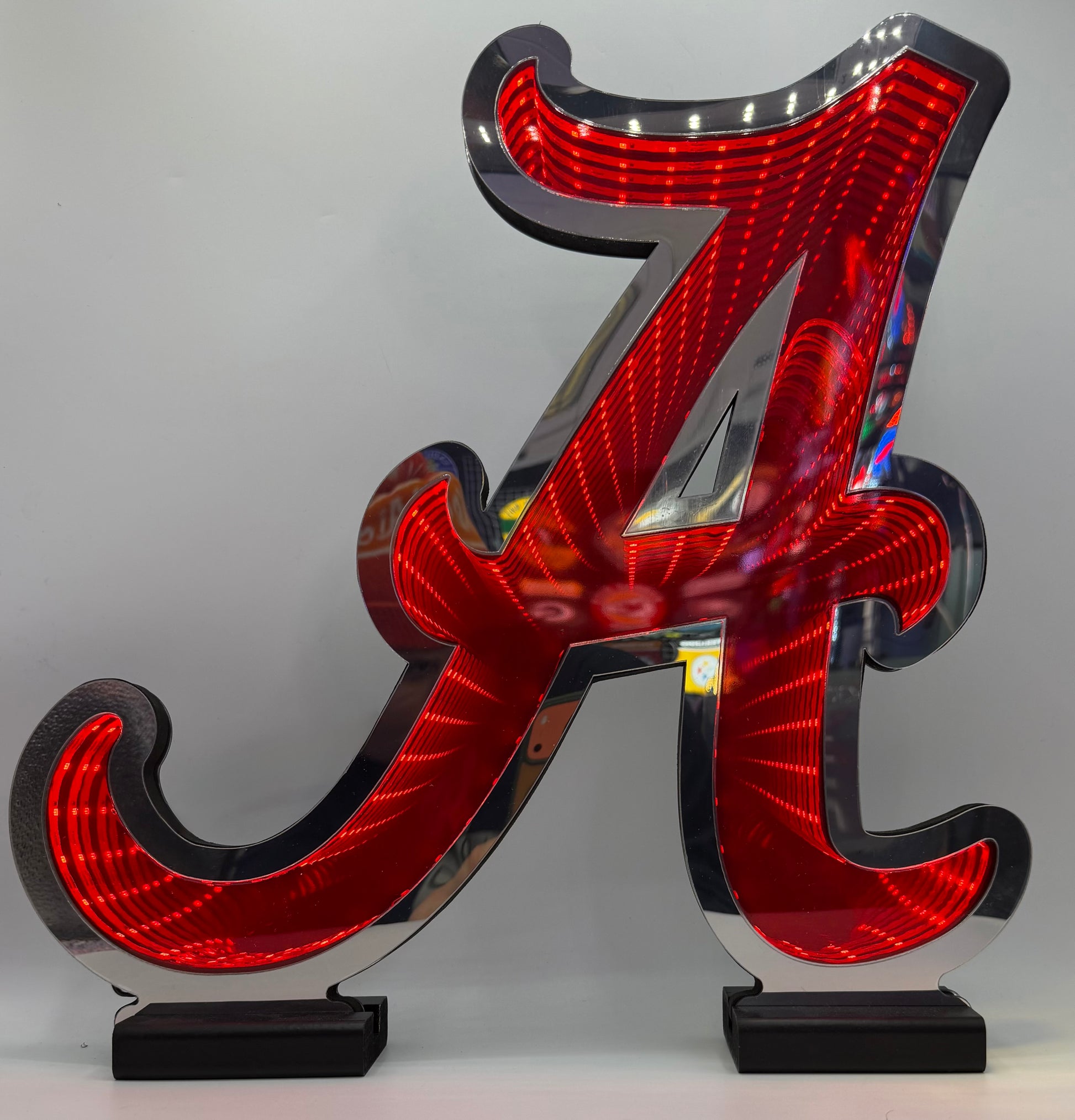 The Alabama “A” Infinity Light showcases one of college football’s most legendary symbols with a bold, illuminated design. Featuring the iconic scripted “A” in deep crimson, layered mirrors and vibrant LEDs create a striking infinity tunnel effect that gives the logo a powerful sense of depth and presence. The clean, timeless design reflects Alabama’s championship tradition and dominance on the field.