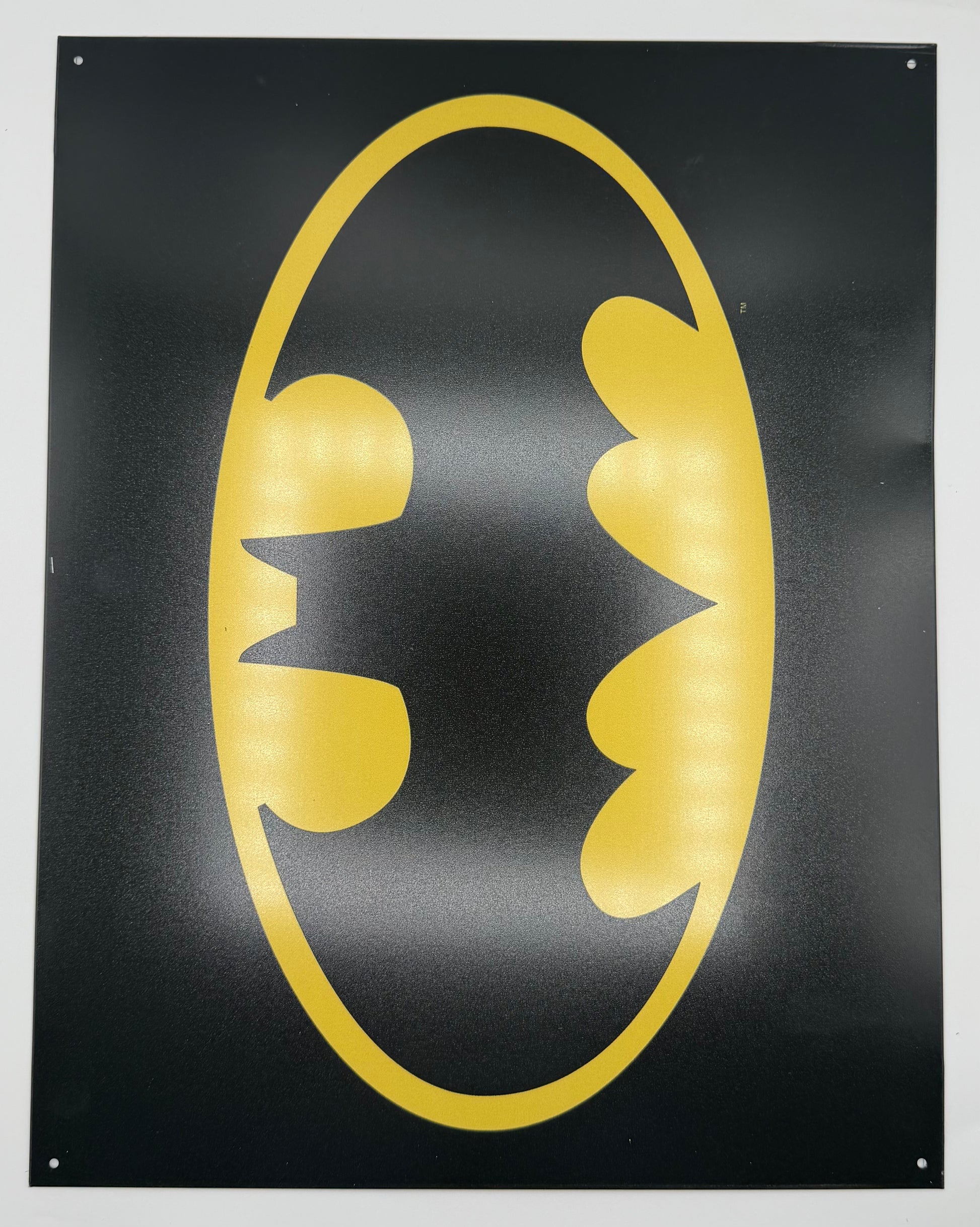 Make a bold statement with this sleek and modern Batman "Bat-Signal" tin sign. Featuring the legendary black bat silhouette encased in a vibrant yellow oval, this design is the ultimate symbol of justice in Gotham City. Set against a deep, matte-black background, the logo’s high-contrast colors are designed to stand out, offering a clean and minimalist look that perfectly captures the Dark Knight’s enigmatic presence.