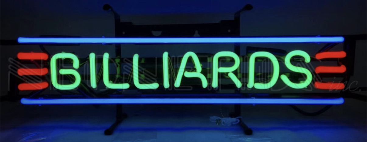 Bring classic game-room vibes to life with this real neon glass sign featuring bold “Billiards” lettering. Crafted with white, hand-blown neon tubing, the bright green text is accented by vibrant red and blue neon lines, all backed by a beautiful full-color image for added depth. The entire sign is supported by a durable black finished metal grid, giving it a sturdy, professional look that stands out whether it’s lit or off.