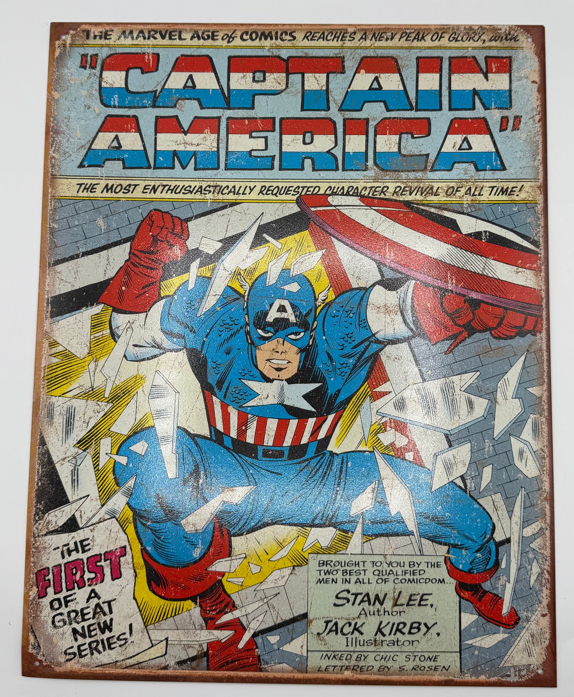 Celebrate the dawn of a new era in Marvel history with this stunning recreation of a classic comic book cover. This sign captures the high-intensity energy of Cap smashing through the glass, complete with the legendary credits for Stan Lee and Jack Kirby. The "distressed" rusted edges and faux-crackle finish give it an authentic, antique feel, as if it’s been hanging in a local corner shop since the 1960s.