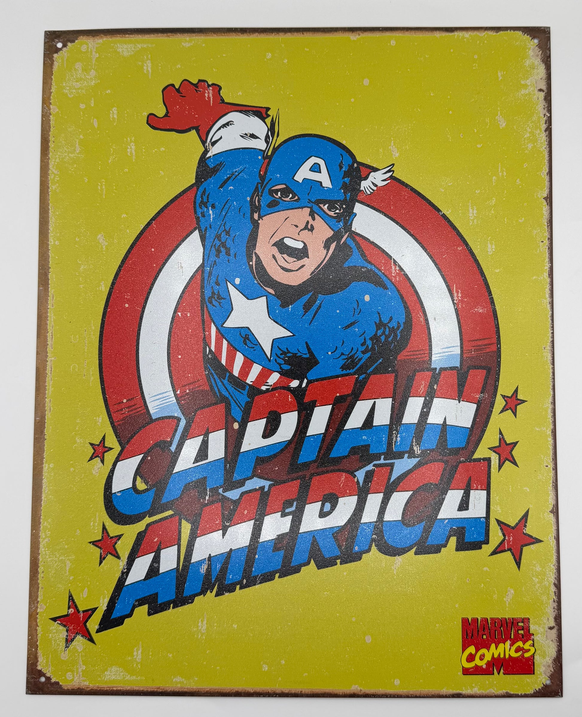 This sign is crafted with a heavy vintage distressed look, featuring simulated rust along the edges and "weathered" scuffs across the surface to give it the character of a decades-old collectible. The matte finish eliminates glare, allowing the action-packed artwork to shine in any lighting. Lightweight and durable with pre-drilled holes for easy mounting, itβs an ideal addition to a garage, bar, or bedroom for any fan of the First Avenger.