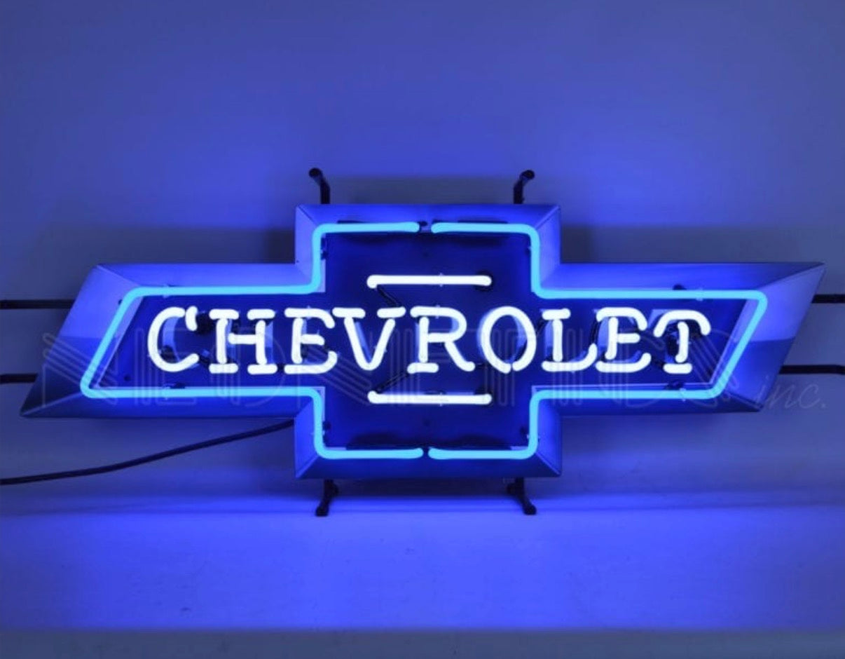 Illuminate your space with the most iconic symbol in automotive history with this real neon glass sign featuring the legendary Chevrolet Bowtie. Meticulously crafted with vibrant blue and white hand-blown neon tubing, the classic "Chevrolet" script and iconic border glow with a precision that honors the brand's heritage. The neon is mounted on a sleek, contoured background that perfectly mirrors the famous emblem, all supported by a durable black finished metal grid for a professional and stable display.