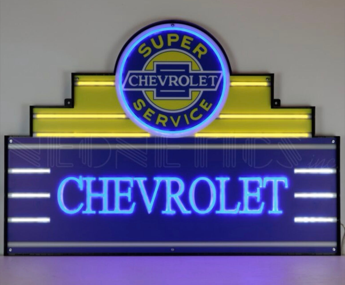 Revitalize your walls with this massive, tiered LED tin can sign. This multi-level display features the classic "Super Service" bowtie emblem at its peak, illuminated in a rich, electric blue. Below, the iconic "CHEVROLET" name radiates in a brilliant blue LED technology that perfectly mimics the look of traditional neon. The design is accented with horizontal yellow and white LED strips that provide a clean, modern glow across the high-quality graphic backing.