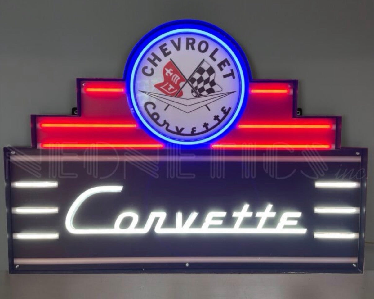 Put your decor in the fast lane with this massive, tiered LED tin can sign. This multi-level display features a circular emblem at its peak, showcasing the legendary Corvette crossed-flags logo encircled by a brilliant, electric blue ring. Below, the iconic Corvette script radiates in a crisp, high-definition white light. The design is electrified by tiered horizontal red and white accents, utilizing advanced LED technology to perfectly mimic the vibrant, warm glow of traditional neon.