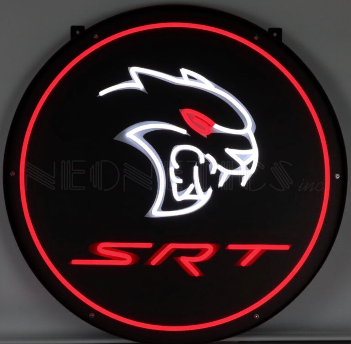 Bring the fierce energy of the track into your home with this circular LED tin can sign. This piece features the legendary Hellcat head logo, brilliantly illuminated with a crisp, high-definition white glow. The "SRT" name radiates in a bold, performance-red light at the base, all encircled by a vibrant, continuous red border. Utilizing advanced LED technology, this sign perfectly mimics the intense, warm glow of traditional hand-blown glass neon while remaining energy-efficient.