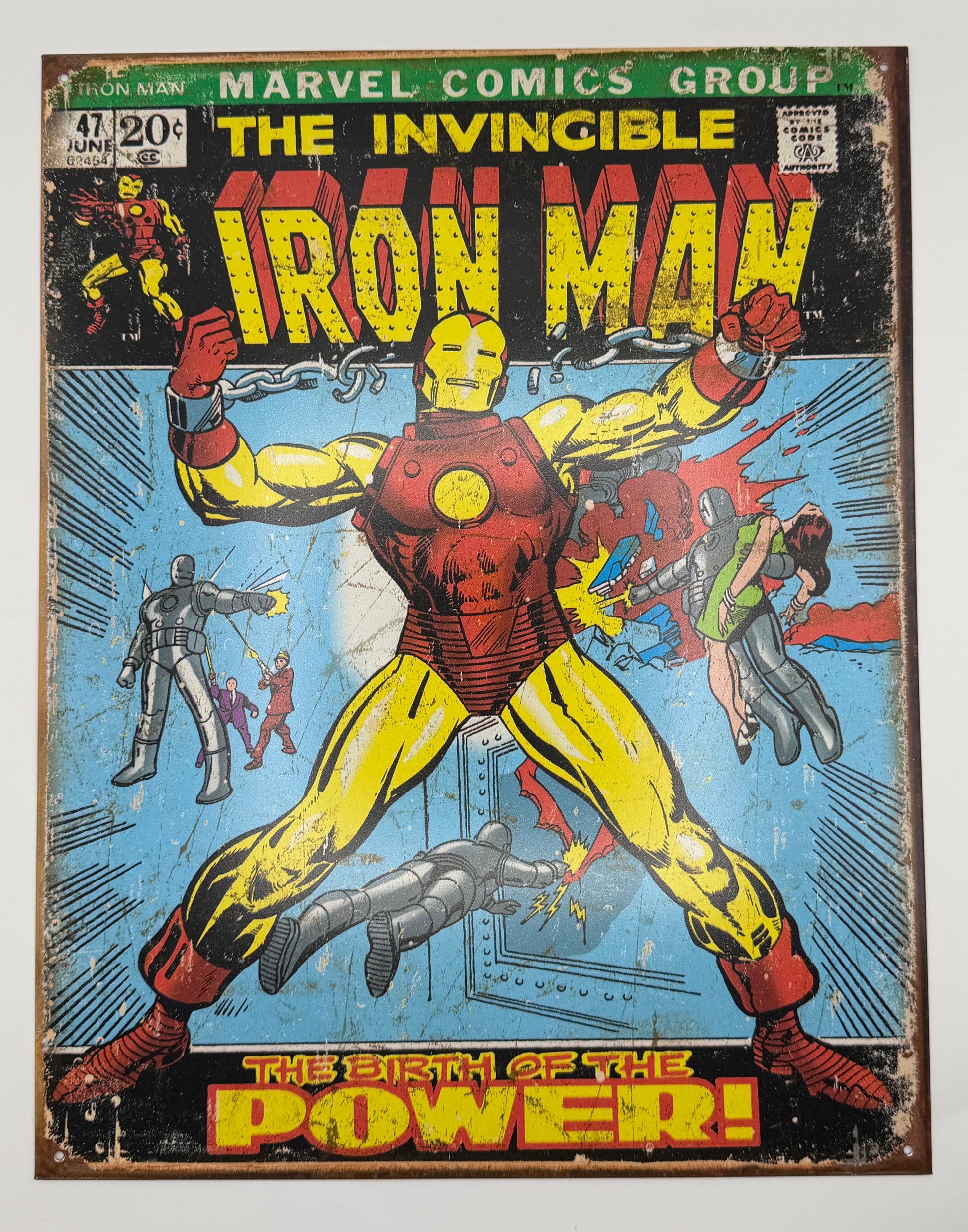 Relive a classic moment in Marvel history with this Iron Man #47 tin sign. Featuring the iconic "The Birth of the Power!" cover art, this sign depicts Tony Stark in his classic red-and-gold armor, heroically breaking free from heavy chains. The composition is packed with Golden Age action, featuring secondary characters and a dramatic blue-rayed background that draws all eyes to the Invincible Iron Man. The top banner displays the "Marvel Comics Group" branding, complete with the original "20Β’" price and "June" issue markings, making it an authentic tribute to 1970s comic culture.