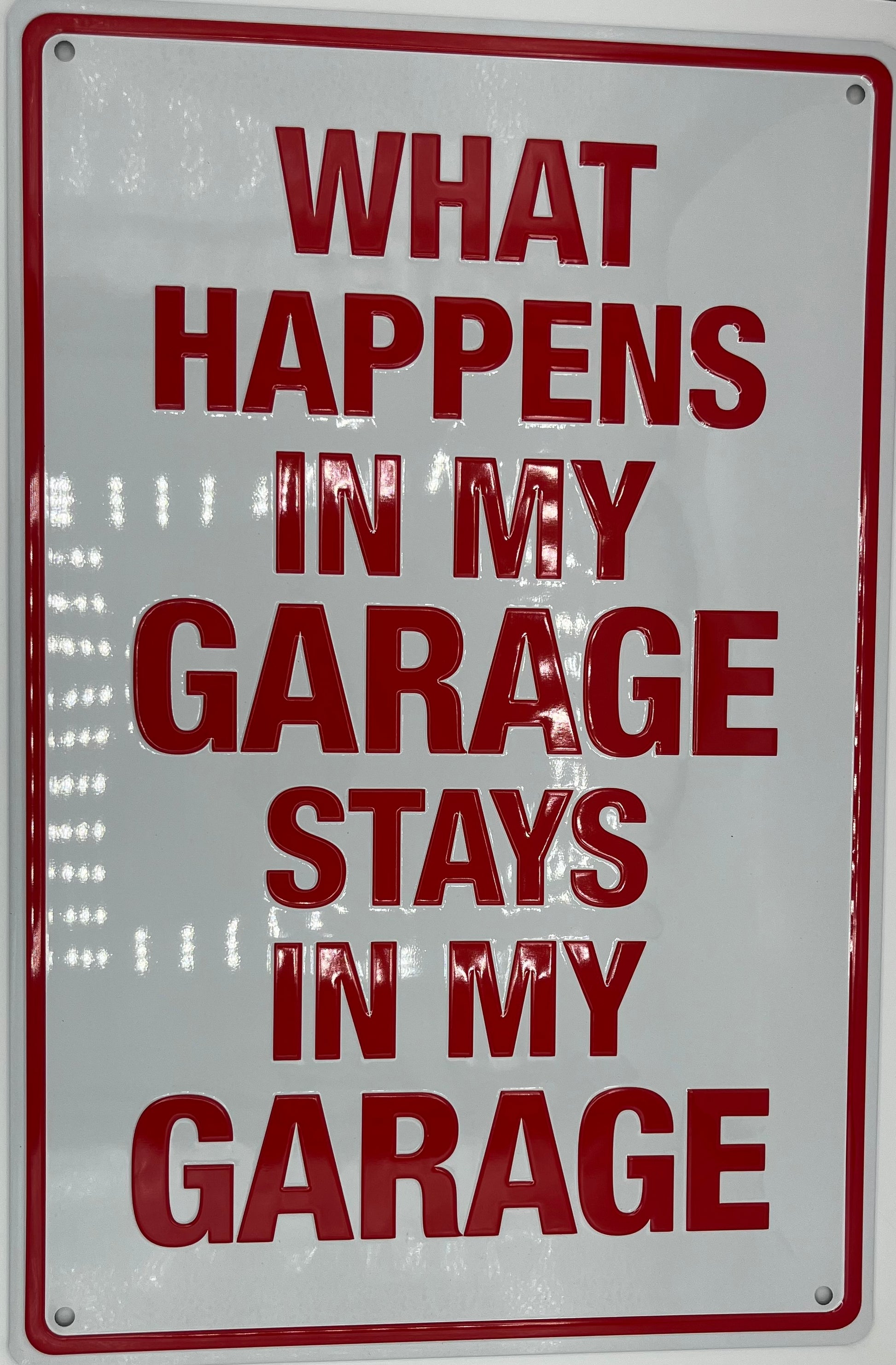 This humorous metal sign lays down the law with bold red embossed lettering that declares, “What Happens in My Garage Stays in My Garage.” Set against a crisp white background and framed with a clean red border, it captures the spirit of every hobbyist’s sacred workspace — where projects, tinkering, and maybe a few secrets stay behind closed doors. Its glossy finish and raised lettering make it pop with attitude and style.