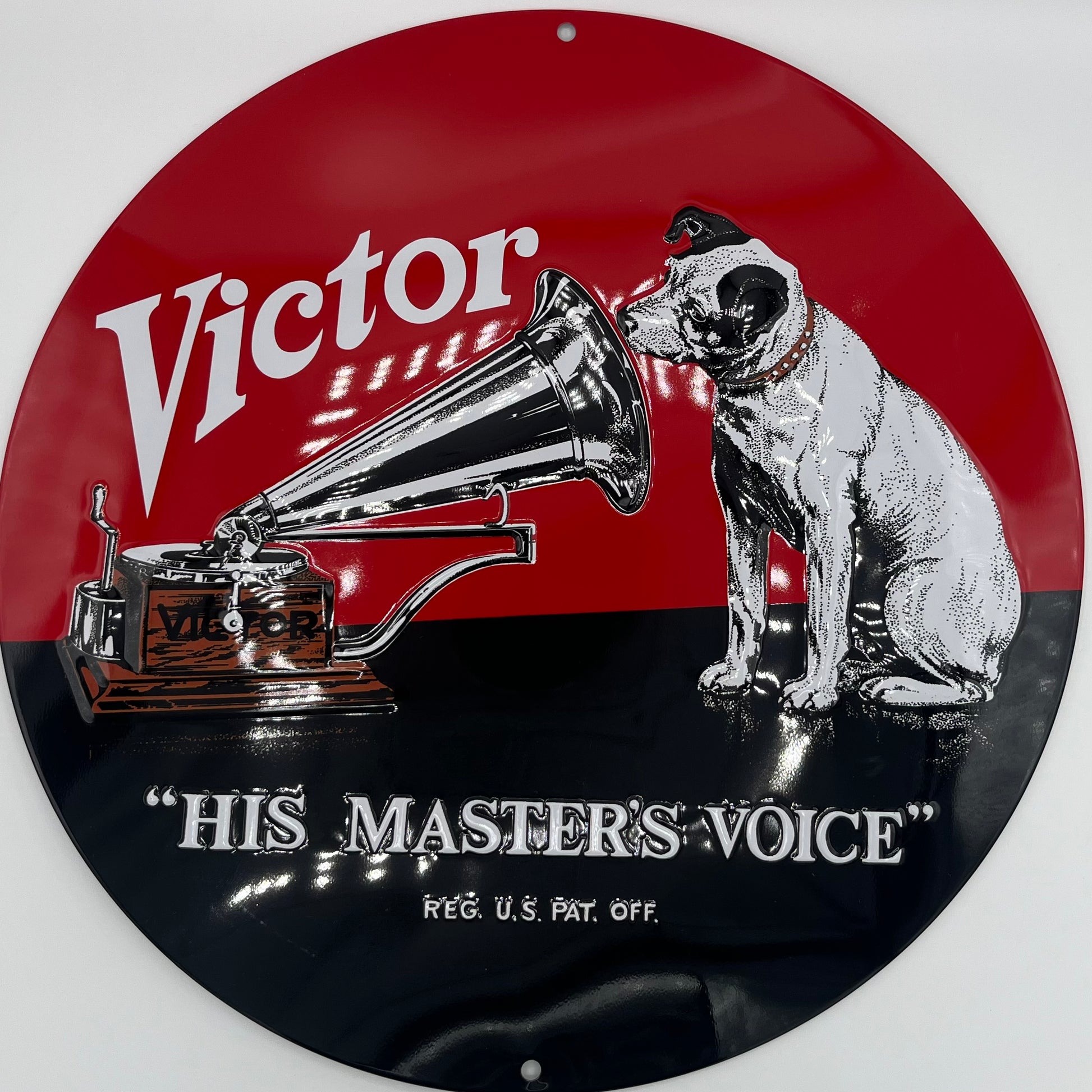 Celebrate a timeless symbol of audio history with this Victor “His Master’s Voice” vintage metal sign, featuring the iconic image of a dog listening intently to a gramophone. With its bold red, black, and white design and high-gloss finish, this embossed piece perfectly captures the nostalgia of early 20th-century advertising and the golden age of recorded sound. It’s a classic nod to one of the most recognizable logos in music history.